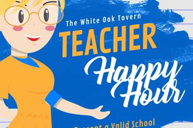 Teacher's Happy Hour Location: The White Oak Tavern Address: 10030 Baltimore National Pike, Suite D240, Ellicott City, MD 21042 Recurrence: Recurring weekly on Friday Time: 3:00 PM to 6:00 PM View website Overview Map Details Map ALL YEAR ROUND Every Friday 3p-6p: 20% off entire check. Must present valid school ID